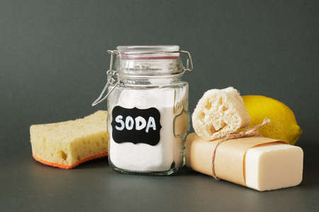 soap, luffa, soda jar, lemon, wooden brush and sponge on hv dark green background copy space, eco cleaning concept, use of non-toxic detergents in house cleaning