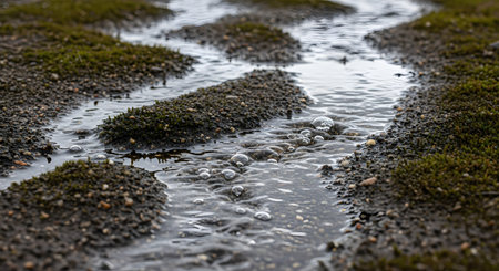 Small streams of clear water trickle through dark sand and patches of green moss. The miniature landscape resembles a river delta or natural erosion patterns on a small scale.