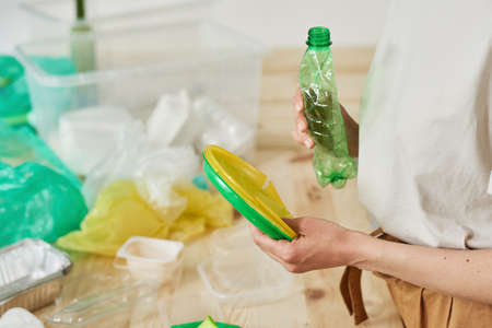 Close-up of woman holding plastic rubbish in her hands and sorting it