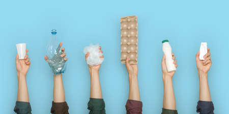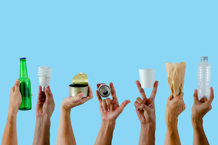 Hands holding and show recycle materials on blue background. Reuse and Recycle for World environment concept.