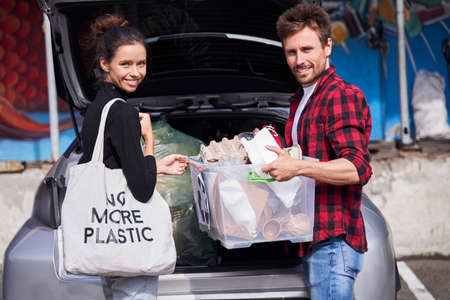 Two perrson sorting garbage. Concept of recycling. Zero waste