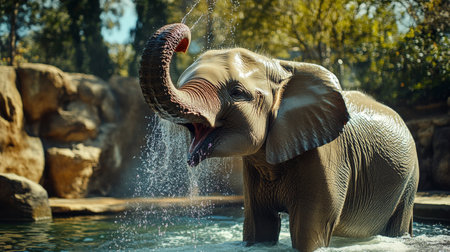 A detailed shot of a playful elephant spraying water with its trunk, capturing the joy and interaction in its spacious zoo habitat.