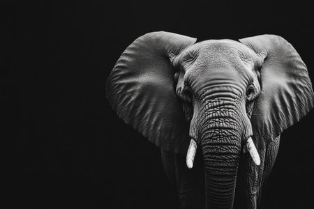 Black and white portrait of an elephant showcasing its prominent features and tusks against a dark background
