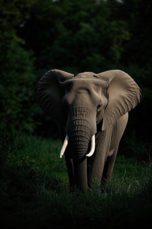 An impressive African elephant emerges from the golden-lit jungle. Wildlife scene.