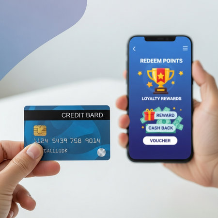 Mobile phone displaying loyalty rewards program with accumulated points balance and options to redeem or view card
