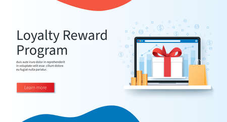 Customer loyalty reward program banner. Laptop with gift box on the screen. Marketing program concept. Web vector illustration in 3D style