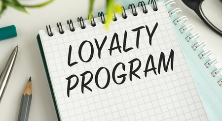 A notebook with the word Loyalty Program written on it. The notebook is on a table with a pen and a pair of glasses