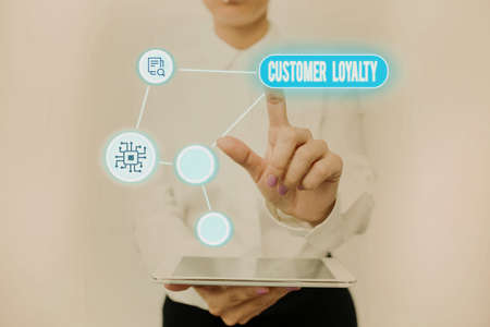 Conceptual caption Customer Loyalty. Business concept customers are devoted to a company s is products or services Lady Holding Tablet Pressing On Virtual Button Showing Futuristic Tech.