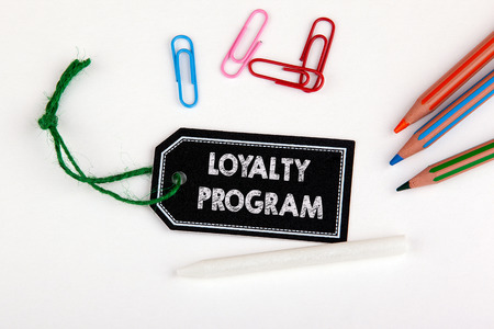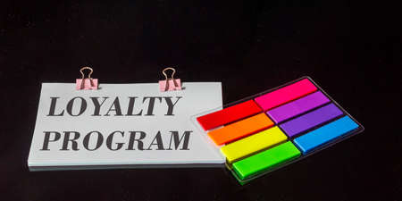 The text Loyalty program is written on a sticker, next to the colored stickers on a black glass background