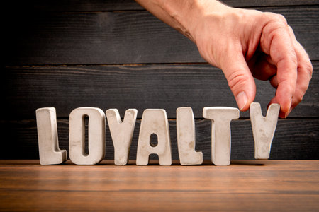 Hand Placing LOYALTY Text on Wooden Desk