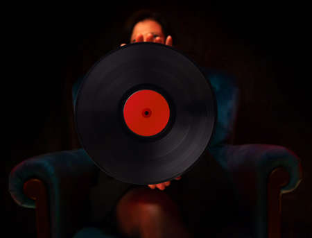 young woman holding vinyl record her face. High quality photo