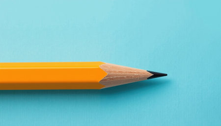 A yellow pencil with sharpened tip rests on light blue background, showcasing its sleek design and vibrant color
