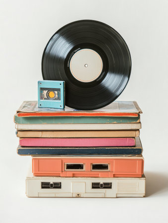 Various colorful cassette tapes and vinyl records are displayed artistically, showing the retro music culture prominently.