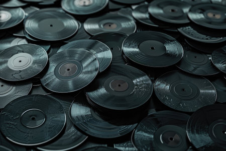 Pile of classic audio player LP vinyl records. Old-fashioned plastic music plates for turntable. Generative AI