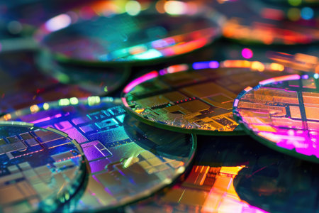 A close-up photo showcasing an assortment of differently colored discs in vibrant hues and various textures, Silicon wafers with printed circuit board, AI Generated