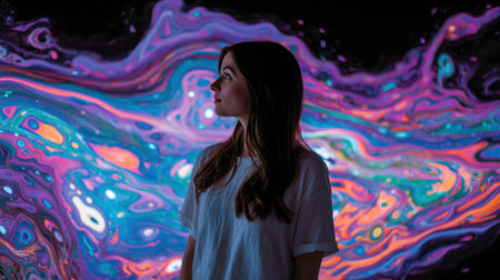 A beautiful woman stands against a vibrant and colorful abstract background, embodying serenity and deep thought. This artistic portrait captures emotion and creativity.