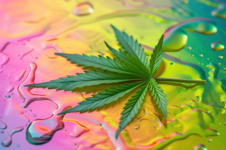 Single cannabis leaf centered on a vibrant, multicolored background created by oil and water droplets