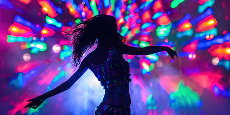 A dynamic display of colorful lights and shadows in the night, capturing the essence of a vibrant and mysterious event.