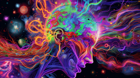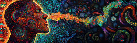 A man's profile filled with intricate, colorful patterns emits a stream of radiant hues, creating a surreal atmosphere. The artwork blends mystical elements with abstract forms and textures.
