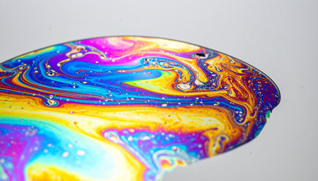 A mesmerizing macro view captures the chaotic yet beautiful dance of iridescent colors across the delicate surface of a soap bubble.