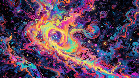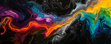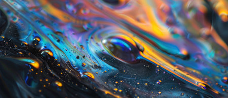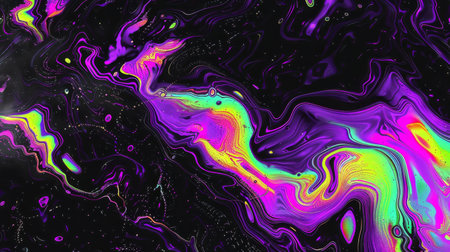 Vivid abstract swirl with iridescent colors and cosmic particles flowing through black marbled liquid dynamic texture background.