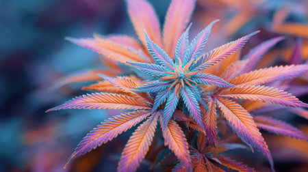 A cannabis plant displays striking hues of purple and blue among its leaves, thriving in a vibrant, natural setting during the day. The colors create a captivating visual effect.