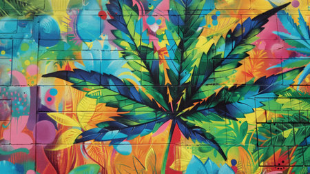 Dynamic mural of an oversized cannabis leaf highlighted by vibrant splashes of color and urban aesthetic.