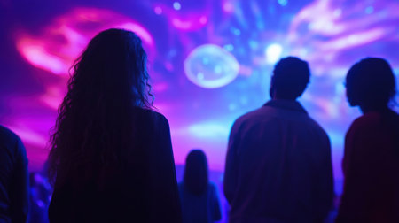 A closeup view of audience members captivated by the pulsating holograms that float above them illuminated by shifting lights from the IoTcontrolled stage integrating a techsavvy atmospher