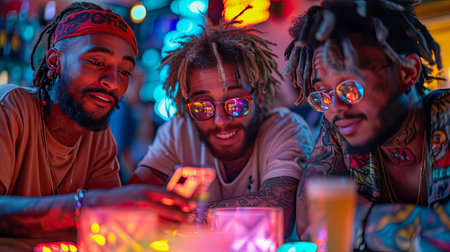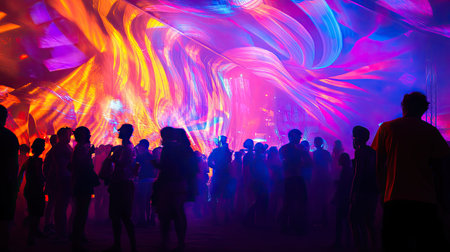 Friends gather in a lively downtown venue, dancing under vibrant neon lights. The atmosphere is electric with music, laughter, and colorful visuals creating an unforgettable night.