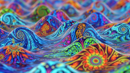 A close-up view of undulating organic waves filled with intricate swirling floral patterns in vivid blues purples...