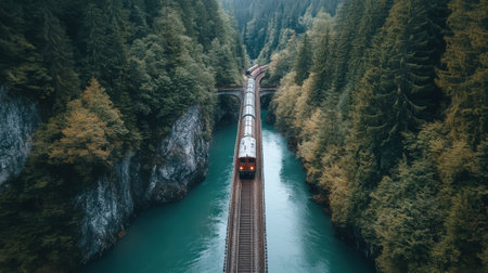 A train travels along a winding track through dense forests and alongside a serene river, surrounded by majestic mountains. The vibrant foliage adds to the beauty of this peaceful setting.
