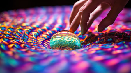 Close-up of a hand playing with a crystal ball on a colorful background