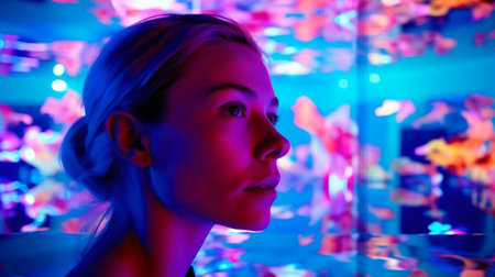 Holographic makeup glow under disco lighting aura effect closeup portrait colorful bokeh atmosphere