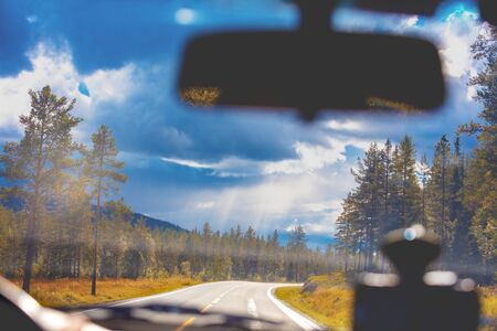Driving a car on a mountain road. View from the windscreen of beautiful nature of Norway