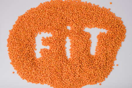 Orange lentils nicely laid out on a white background. Top view. Vegetarian food. Greenish background