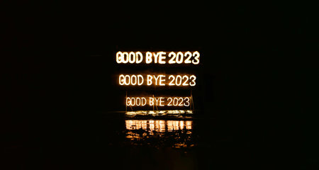 Good bye 2023 triple illuminated sign installation in water on the beach on black. Old year is burning. Happy winter holidays made of lights and garland. Street advertisement.