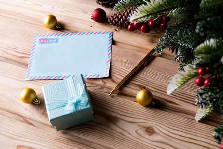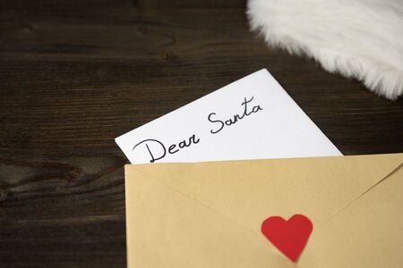 Letter to Santa in an envelope. Wooden background. Christmas and New Year concept