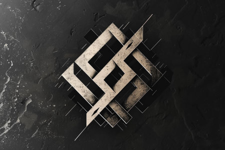 An abstract logo with geometric shapes is displayed on a textured metallic surface. The design features interconnected elements within a square frame. The image has a subtle lighting, and the overall composition suggests a modern aesthetic suitable for various design and conceptual applications.