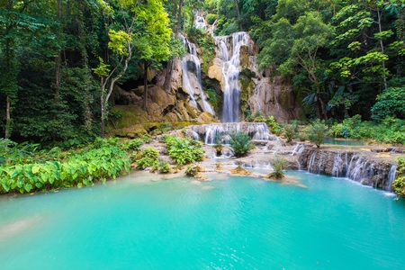 Blue turquoise water pond Kuang Si waterfall among rain forest in Luang Prabang, Laos during summer season.