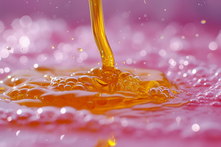 Beautiful close-up of engine oil flowing in warm sunset light, capturing the rich amber color and reflective qualities of the liquid for automotive themes.