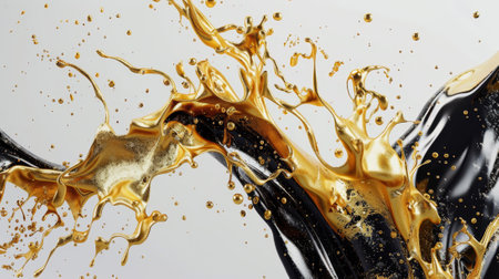 A splash of gold and black paint on a white background. Scene is energetic and dynamic
