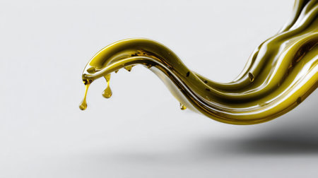 This image features a flowing stream of golden oil on a smooth white surface, showcasing the natural beauty of culinary ingredients in a dynamic and elegant manner.