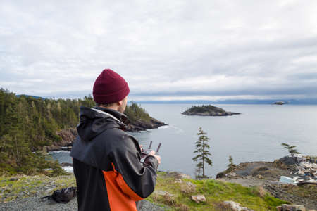 A professional drone pilot flying a drone near the ocean.