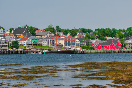 Lunenburg, Nova Scotia, Canada - 12 August 2021: Lunenburg waterfront from across the bay. Lunenburg is a UNESCO World Heritage Site.