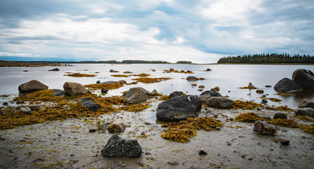 Rocky beach with seaweed in the White Sea at low tide against the background of cloudy sky. Concept of untouched coastal environment. Murmansk, Russia.