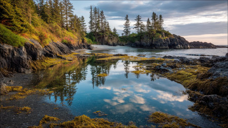 A serene coastal landscape featuring calm waters reflecting the sky, surrounded by lush trees and rocky formations at dusk, perfect for outdoor enthusiasts.