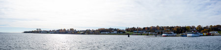 Clear showing coastal townscape with colorful autumn trees and water reflections keywords: city, cityscape, town, coastal, waterfront, harbor,...