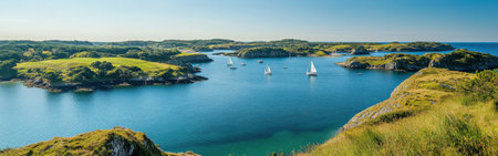The Gulf of Morbihan showcases tranquil blue waters with sailboats gently drifting among small islands, framed by a lush green landscape under clear skies.