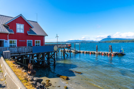 Calm, clear blue water lapping against the shore complements a vibrant red wooden building and pier in Tofino, British Columbia, with distant mountains and a small wind turbine enhancing the scene