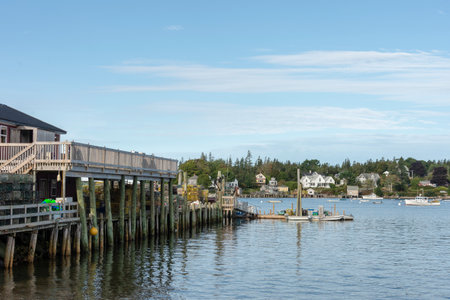 Bass Harbor, Maine, USA - September 21, 2018: Quiet waterfront in Bass Harbor with lobster boats in background